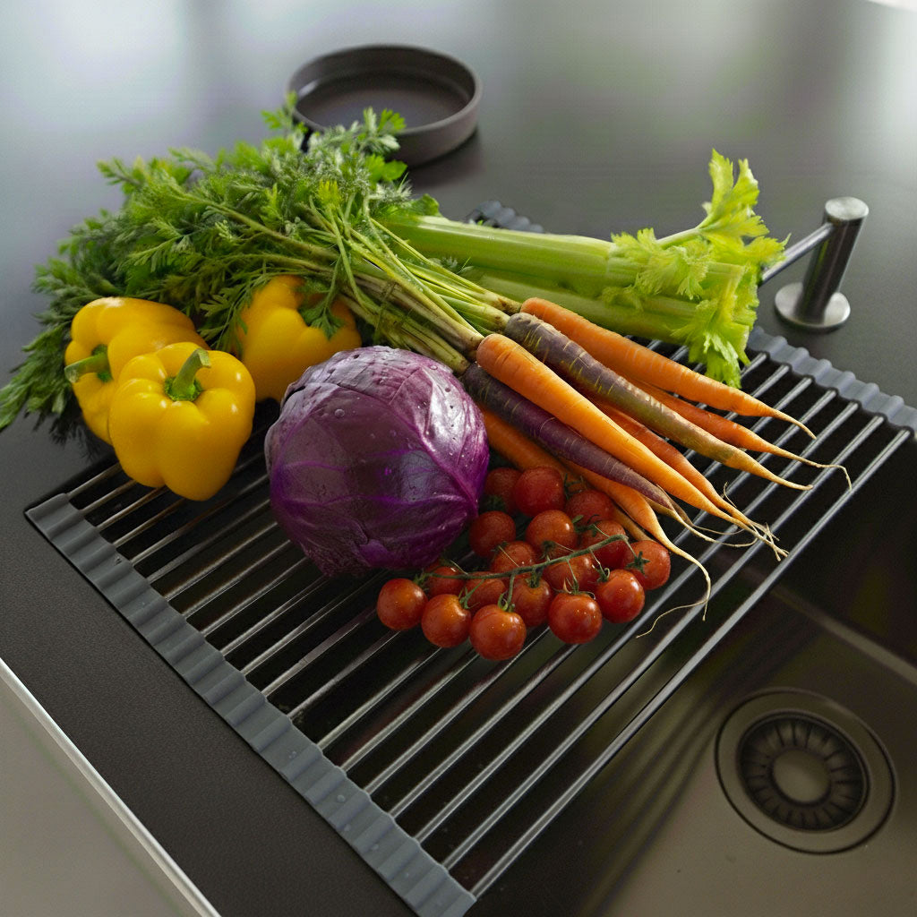 Optimisez l’espace dans votre cuisine avec notre ingénieux égouttoir enroulable Rollmat. Aussi pratique qu’élégant, il est constitué de tubes métalliques robustes avec extrémités en silicone antidérapantes. Il se déroule facilement au-dessus de l’évier pour offrir une surface stable et aérée idéale pour égoutter vaisselle, verres, casseroles, fruits et légumes. L'eau se déverse alors directement dans l'évier.